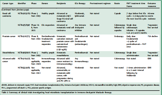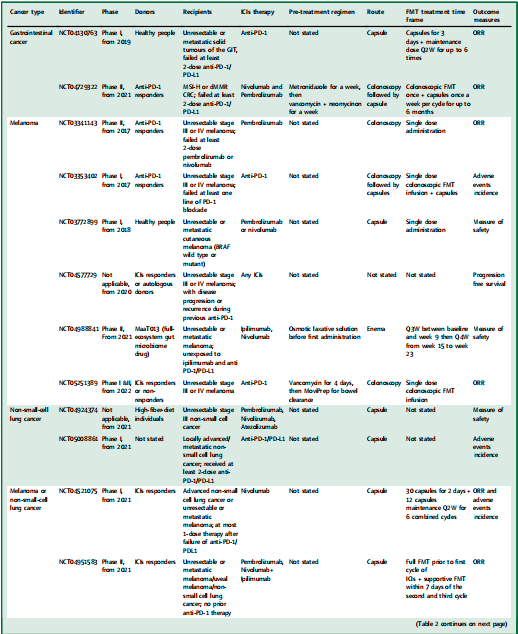 FMT可以通过微生物及其活性产物调节肠道微生物平衡和免疫平衡,以治疗疾病。这种前沿的技术进步在艰难梭菌感染(CDI)中显示出安全的疗效。目前,许多临床试验正在进行中,以确定FMT在多种癌症性疾病中的有效性。FMT直接塑造肠道微生物组,并选择性地改变微生物的组成和丰度,从而间接影响ICIs。FMT辅助抗肿瘤免疫疗法一直引人注目,目前有几项临床试验正在进行中(表2)。通过将健康和平衡的微生物群落作为一个整体移植到一个不平衡的生态系统中,FMT可能重新建立肠道的微生物平衡和整个身体的稳态。FMT治疗主要通过提高异质性反应率、逆转ICI免疫疗法的抵抗性和削弱潜在的irAEs,发挥其增强免疫力的效果,同时具有减少频繁干预的需求的显著优势。两项在转移性黑色素瘤患者中进行的里程碑式的FMT临床试验证明了FMT在增强抗PD-1反应方面的有效性和安全性,说明了它在抗肿瘤联合治疗中的巨大应用前景。这些结果证实了FMT在重新诱导抗PD-1治疗方面的有效性和安全性,并共同支持了通过调节肠道微生物组来增强肿瘤免疫疗法的概念。