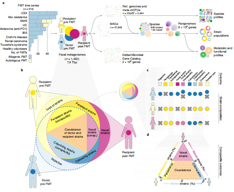 最终,这两项重大的临床突破共同证实了 FMT 结合 PD-1 阻断策略可以改善肠道菌群和重编程肿瘤微环境,以逆转对抗 PD-1 治疗的耐药性,治疗难治性黑色素瘤。值得注意的是,两项研究都强调了厚壁菌门 与 ICIs 临床反应效果之间的关联;然而,宿主分类群与临床反应之间的关系存在争议。在一项最近的研究中,研究人员分析了 316 例 FMT 的宏基因组,这些 FMT 是在治疗十种不同疾病指标的前后采样的。他们认为,接受者而不是供体决定了 FMT 后肠道菌群的“混合”状态。深入的研究没有发现任何菌株本质上比其他菌株更具侵袭性/抗逆性的强有力证据。相反,菌落结构和多样性,以及供体-接受者菌落互补性决定了 FMT 后肠道菌群的恢复力、共存和定殖。在另一项综合的宏基因组学系统性荟萃分析中,报道了供体菌株移植率较高的患者更有可能在 FMT 后获得临床成功。有力的随机对照试验有必要更清楚地勾勒出这种联系。