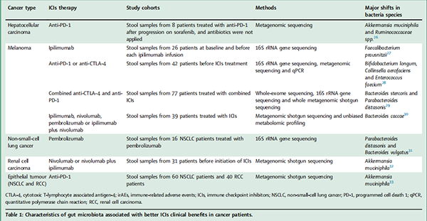 表1与癌症患者更好的ICIs临床益处相关的肠道微生物群特征