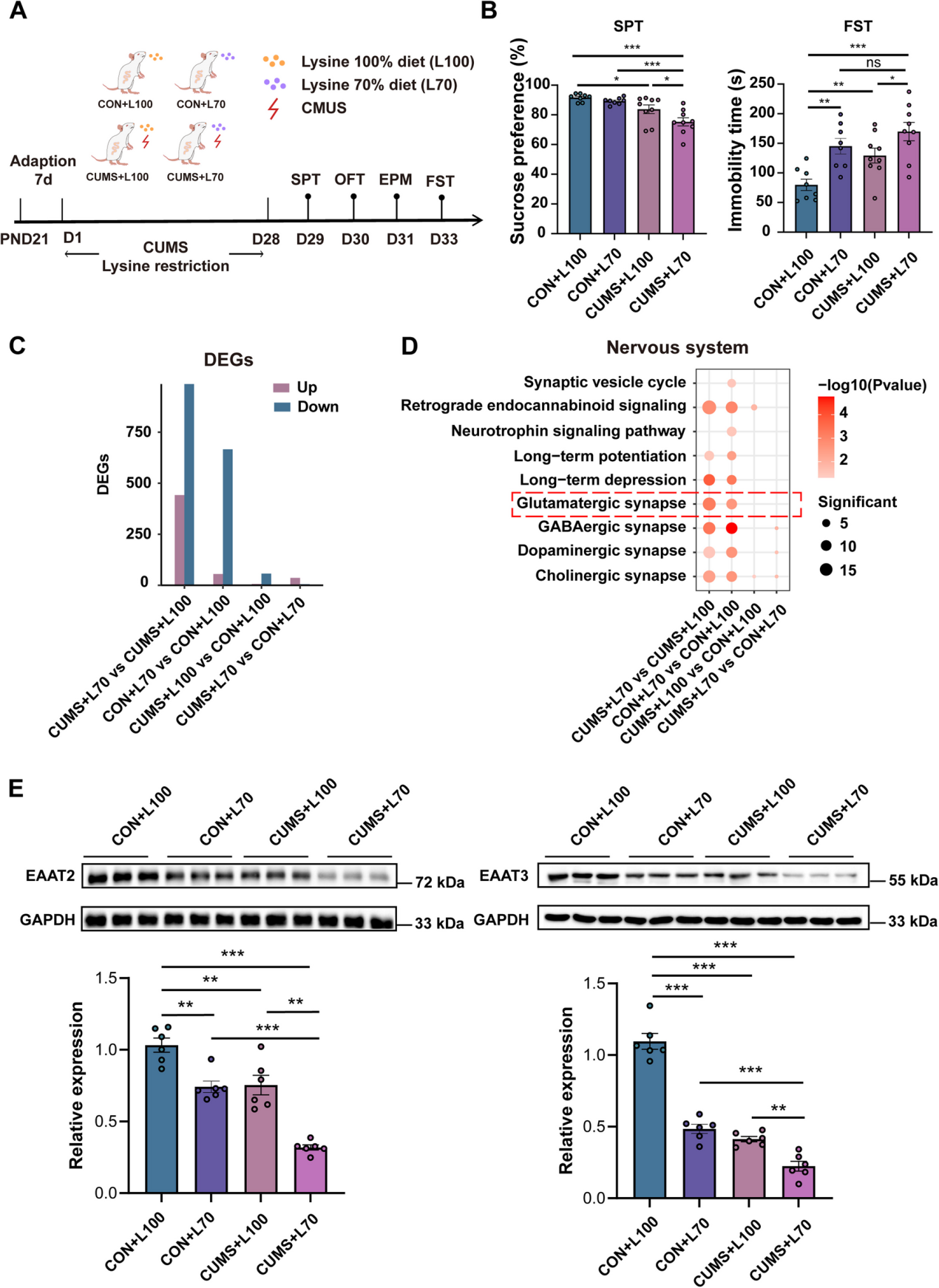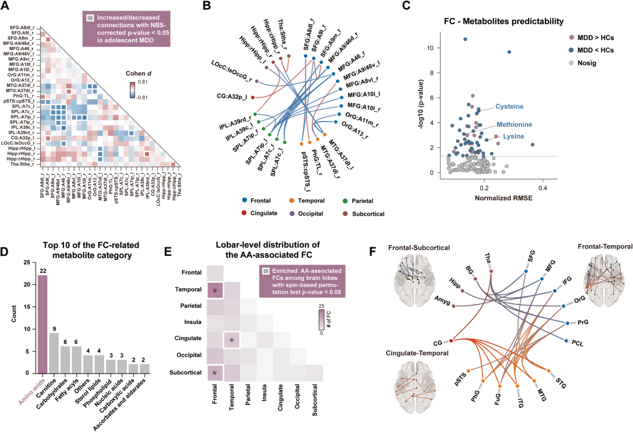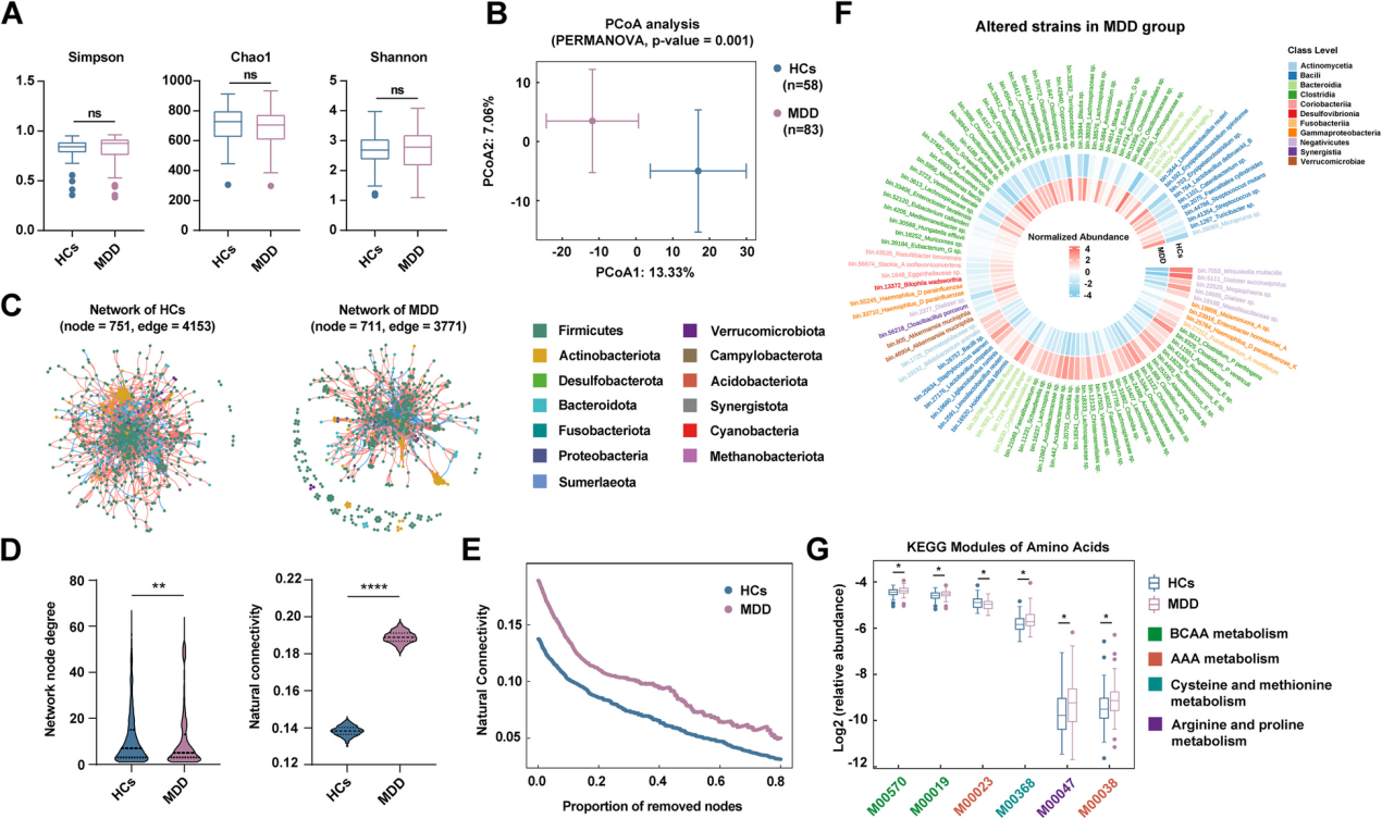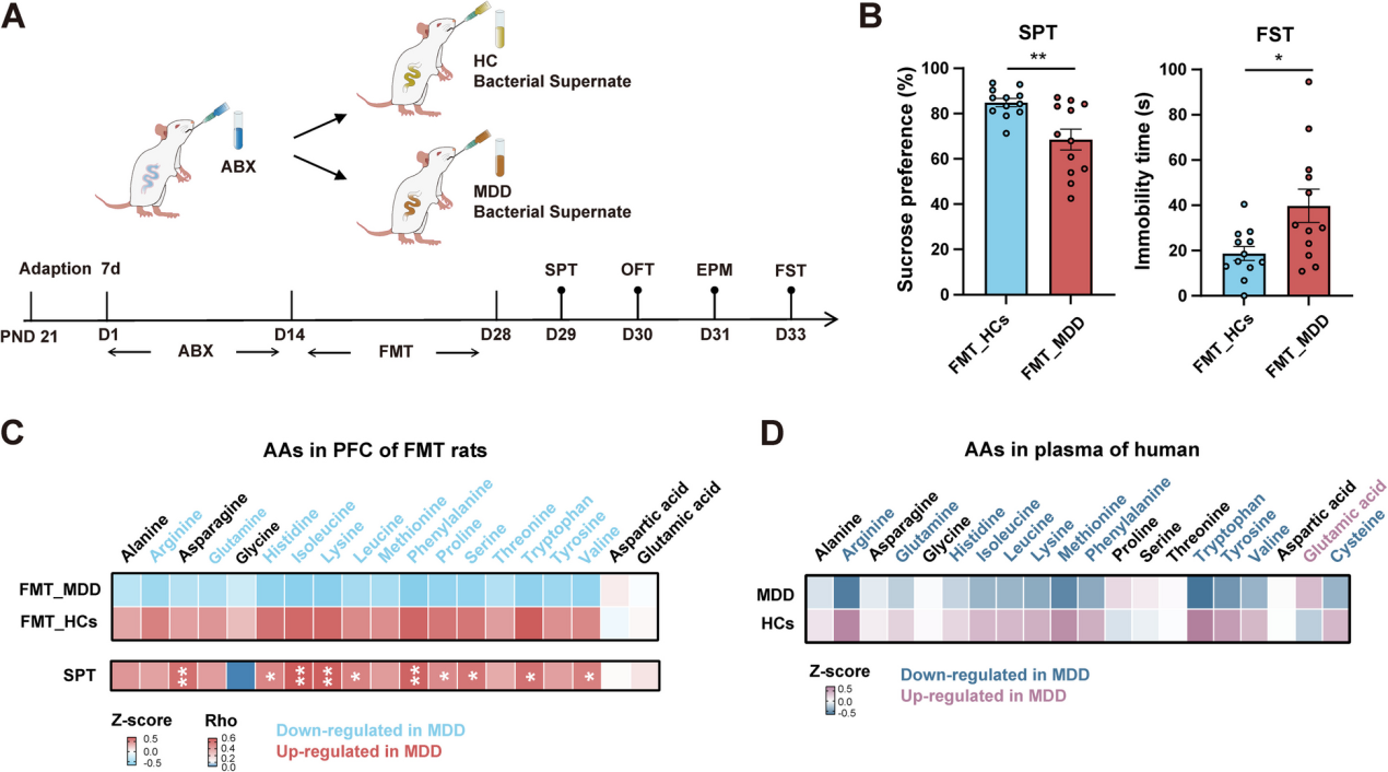 儿童和青少年的主要抑郁症(MDD)是一个日益严重的全球公共卫生问题。微生物群-肠-脑(MGB)轴的代谢变化被认为与MDD的病理生理学有关,但其在儿科人群中的具体作用尚不清楚。作者对256名儿童和青少年的MDD患者以及307名健康对照者进行了多组学研究,整合了血浆代谢组学、粪便宏基因组学以及大脑的静息态功能磁共振成像(rs-fMRI)。对360种差异表达代谢物(DEMs)进行KEGG富集分析显示,血浆氨基酸(AA)代谢存在显著缺陷。作者发现了58种在MDD中富集的菌株和46种在MDD中耗竭的菌株,以及在粪便宏基因组学中6个改变的氨基酸代谢模块。Procrustes分析揭示了改变的肠道微生物群与循环AA代谢之间的关联。因果分析表明,血浆AAs可能介导了改变的肠道微生物群对抑郁和焦虑症状的影响。此外,rs-fMRI显示,额叶的连接缺陷与抑郁和22种AA代谢中的DEMs有关。此外,将MDD患者的粪便微生物群移植到青少年大鼠中,诱导了抑郁样行为和前额叶皮质(PFC)中14种氨基酸的缺乏。此外,饮食中赖氨酸的限制通过降低PFC中兴奋性氨基酸转运蛋白的表达,增加了青少年大鼠对抑郁的易感性。研究结果表明肠道微生物群的改变导致了AAs的缺乏,特别是赖氨酸,在儿童和青少年MDD的发病机制中起着关键作用。靶向AA代谢可能为儿科抑郁症提供新的治疗策略。 1、儿童和青少年抑郁症患者的血浆氨基酸缺乏 为了研究儿童和青少年抑郁症的代谢特征,作者招募了256名MDD患者和307名健康对照者。采用液相色谱-质谱联用(HILIC-MS)和反相液相色谱-质谱联用(RPLC-MS)进行分析,识别出360种差异表达代谢物(DEMs),其中与健康对照者相比,抑郁症患者中有297种血浆代谢物表达下调,63种表达上调(图1B)。对DEMs进行KEGG富集分析,在2级水平上识别出31条失调的代谢通路,在3级水平上识别出122条通路。氨基酸代谢是富集程度最高的2级KEGG通路(图1C),涉及13条3级通路,如精氨酸和脯氨酸代谢、酪氨酸代谢以及赖氨酸生物合成(图1D)。此外,在碳水化合物代谢和消化系统通路中也发现了显著变化(图1C),这些通路已知与抑郁症相关。 在人类肽和蛋白质中存在的20种氨基酸(AAs)中,有13种氨基酸显著失调,包括8种必需氨基酸(赖氨酸、蛋氨酸、色氨酸、异亮氨酸、亮氨酸、苯丙氨酸、缬氨酸和组氨酸)、2种条件必需氨基酸(半胱氨酸和酪氨酸)以及3种非必需氨基酸(精氨酸、谷氨酰胺和谷氨酸)。此外,在儿童和青少年抑郁症患者中,5-羟色氨酸—色氨酸(一种必需氨基酸)在血清素生物合成中的中间代谢物——表达下调,这表明在生长过程中对必需氨基酸的需求增加可能促成了这些氨基酸在抑郁症背景下发生改变,因为它们直接发挥作用或作为神经递质的前体。图1E提供了氨基酸代谢变化的总结。总体而言,这些发现表明,患有抑郁症的儿童和青少年的血浆代谢组发生了显著变化,特别是在参与神经递质和蛋白质合成的氨基酸中。 图1 儿童和青少年抑郁症患者的血浆氨基酸缺乏 2、儿童和青少年抑郁症患者存在的特定粪便微生物生态系统 鉴于宿主氨基酸代谢与肠道微生物群之间的密切联系,作者对上述队列中的83名MDD个体和58名健康对照个体的粪便样本进行了宏基因组测序。为了进一步阐明MDD患者和健康对照者之间不同的微生物组成,作者采用LEfSe分析来识别58种在MDD中富集的菌株和46种在MDD中减少的菌株。大多数改变的MAGs属于梭菌纲(图2F)。与成人抑郁症中肠道微生物群失调的发现一致,在作者的青少年抑郁症患者中,作者观察到Eggerthellaceae bin.1648的富集,这被认为会引发炎症,以及Faecalibacterium(bin.16032和bin.21049)和Bifidobacterium animalis(bin.19192)的减少,这些菌株曾被报道具有抗炎和短链脂肪酸(SCFA)产生的功能。有趣的是,Akkermansia(bin.805和bin.46904)在MDD患者中有所增加。为了便于解释与MDD相关的微生物功能,在所有474个KEGG模块中,有20个在MDD组中增加,20个减少。在这些模块中,作者发现有8个属于ATP合成的模块在MDD组中减少,还有6个氨基酸代谢模块在MDD组中发生改变,例如芳香族氨基酸(AAA)和支链氨基酸(BCAA)代谢(图2G)。总之,这些发现表明,在患有抑郁症的儿童和青少年中,肠道微生物群的分类、共现网络和功能都受到了干扰。 图2 儿童和青少年抑郁症患者存在特定的粪便微生物生态系统。 3、儿童和青少年抑郁症中肠道微生物群与宿主循环氨基酸的关联 近期文献报道了肠道细菌驱动的氨基酸(AA)或氨基酸衍生物参与成人抑郁症的发病机制。为了研究儿童和青少年抑郁症患者中改变的肠道微生物群与循环代谢物之间的关联,作者进行了Procrustes分析,结果显示粪便微生物群与血浆代谢组特征之间存在强相关性(图3A)。此外,典型相关分析(CCA)识别出66种氨基酸代谢途径中改变的血浆代谢物和104种改变的粪便MAGs之间的关联,表明氨基酸代谢中的血浆代谢物沿着改变的粪便MAGs的向量明显分离(图3B)。 随后,作者对患有抑郁症的儿童和青少年以及健康对照组进行了MAGs(微生物基因组组装基因组)-氨基酸(AAs)-症状轴的Spearman相关性分析。作者分析了在中介分析中识别的每个MAG中的氨基酸代谢基因簇。在中介分析中识别的15个MAGs在氨基酸代谢途径中表现出完整的生物合成和降解模块的基因组,包括精氨酸、赖氨酸、色氨酸、苯丙氨酸、酪氨酸、亮氨酸、异亮氨酸和蛋氨酸(图3E)。总的来说,这些数据表明特定肠道微生物特征的改变、宿主循环中的氨基酸