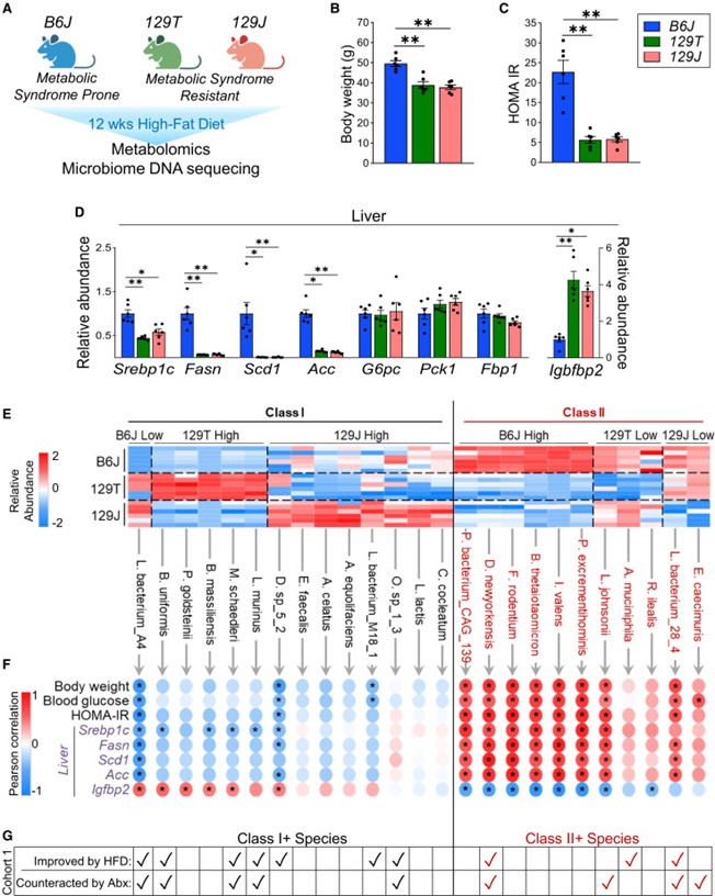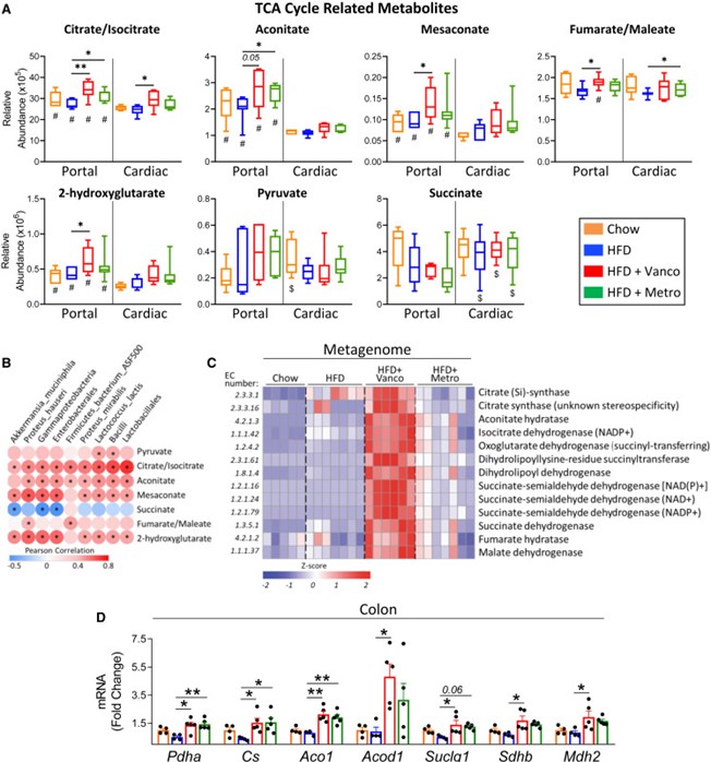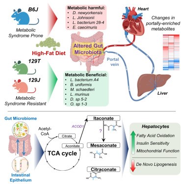饮食和肥胖会通过肠道微生物组等途径,促进胰岛素抵抗和2型糖尿病的发生。为探究肠道代谢物在这一过程中的作用,作者评估了具有不同肥胖/糖尿病易感性的小鼠,在高脂饮食(HFD)联合抗生素处理下,其门静脉/外周血中的代谢物变化。在易患糖尿病/肥胖的C57BL/6J小鼠中,有111种代谢物在门静脉中富集,74种在外周富集,其中许多代谢物在抗代谢综合征的129S1/129S6小鼠中表现不同。万古霉素处理改变了HFD喂养的C57BL/6J小鼠的微生物组,并改变了多种代谢物的门静脉/外周比例,包括上调门静脉血中三羧酸(TCA)循环相关代谢物,如中康酸(mesaconate)。用中康酸、衣康酸(itaconate)或柠康酸(citraconate)处理分离的肝细胞,可在体外和体内改善胰岛素信号传导,并在转录水平上调节糖异生、脂肪酸氧化和脂肪生成相关基因。在人类中,柠康酸水平与血糖呈负相关。因此,门静脉与外周代谢物在微生物组影响肝脏代谢及高脂饮食相关胰岛素抵抗发病机制中发挥重要作用。 1、 门静脉血与外周血的代谢组特征存在差异。 在普通饲料喂养的动物中,门静脉血显著富集111种代谢物,心脏血富集74种(图1A)。在门静脉富集的代谢物中,73%为脂质,包括各类甘油三酯、二酰甘油和磷脂(图1B、1C)。另有6%为初级或次级胆汁酸,6%为氨基酸/N-乙酰氨基酸,4.5%为源自食物的细菌代谢物,如丁酸、色氨酸、组氨酸和维生素A代谢物(图1B、1C)。令人惊讶的是,几种门静脉富集代谢物与TCA循环(顺乌头酸、中康酸和2-羟基戊二酸)或糖异生(磷酸甘油酸/磷酸肌醇丙酮酸)相关(图1B、1C)。这些代谢物在门静脉血中的浓度高于心脏血,提示肠道微生物组、食物和/或肠道是其进入循环的主要来源。相比之下,74种代谢物在心脏(外周)血中显著富集,其中57%为脂质,包括其他种类的甘油三酯、二酰甘油、磷脂、胆固醇酯、二十二碳烷酸类和二十碳烷酸类;19%为氨基酸(甲硫氨酸、组氨酸、色氨酸和赖氨酸);13.5%为核苷或其衍生物,包括AMP、UMP、鸟苷酸(GMP)、肌苷和次黄嘌呤,后者在心脏血中富集2.7至3.4倍(图1B、1C)。心脏/门静脉比值高提示这些代谢物至少部分来源于肝脏或其他宿主组织。 图1 门静脉血代谢物对高脂饮食(HFD)呈现出独特的应答特征。 2、 门静脉代谢物富集——饮食的影响 小鼠连续 11 周摄入 60% 高脂饮食(HFD)后,其门静脉/心脏血中的代谢物组成发生显著改变。门静脉富集代谢物由 111 种锐减至 48 种(其中 31 种与普通饲料组相同),而心脏血富集代谢物则由普通饲料时的 74 种降至 HFD 时的 68 种,仍有 42 种保持不变(图 1B、1D)。门静脉富集代谢物的减少主要源于脂质类大幅减少——从 81 种降至 17 种(图 1B、1D)。在普通饲料与 HFD 之间保持门静脉富集的 31 种代谢物中,包含多条三羧酸(TCA)循环相关产物,提示它们可能来源于微生物组或肠道,而非直接来自膳食。 尽管常规饲料与高脂(HFD)喂养时心脏血富集代谢物的数量相近,仍有6种心脏富集代谢物在HFD下富集度降低,其中包括二十二碳六烯酸(DHA)、二十碳五烯酸(EPA)及20-HDoHE——均为具有抗炎活性的ω-3脂肪酸或其衍生物(图1G)。相反,促炎的ω-6衍生脂肪酸,如二十碳二烯酸、γ-亚麻酸、花生四烯酸及肾上腺酸,在两种循环中的丰度均因HFD而升高。这些促炎代谢物增多、抗炎代谢物减少的变化,可能共同加剧了HFD相关的胰岛素抵抗。 3、 肠道微生物组特征与门静脉血TCA循环代谢物的富集 前面的结果说明 HFD改变肠道代谢物向门静脉的输送,导致促炎环境 ,TCA循环产物可能来源于肠道菌群。为了验证这个可能性,作者通过抗生素干预人为改变菌群结构,万古霉素抑制革兰氏阳性菌,甲硝唑抑制厌氧菌。研究发现,两种抗生素均能改善HFD小鼠的胰岛素抵抗,门静脉中TCA代谢物上升1.5倍,胆汁酸也出现变化(图2A)。两种抗生素对代谢物谱的影响存在差异,提示不同细菌贡献的代谢物不同。 TCA中间物 (mesaconate、aconitate等) 在 门静脉 中的 富集度与某些细菌丰度 ( Akkermansia、Enterobacterales、Lactobacillales 等 ) 正相关(图2B) 。 宏基因组分析发现,这些菌群携带TCA循环酶基因表达量上升(图2D) 。这些结果表明, TCA循环代谢物确实主要来源于菌群代谢,且与特定细菌丰度相关。 抗生素干预提供了直接的因果证据:改变菌群结构可以改变门静脉血代谢物,从而改善宿主代谢。 图2 肠道菌群重构促进TCA循环代谢物在门静脉系统中的富集 4、 整合微生物组差异、抗生素效应与品系差异 作者曾报道,B6J 小鼠在高脂饮食(HFD)下会发生肥胖/胰岛素抵抗,而来自 Jackson 实验室的 129S1(129J)和来自 Taconic 的 129S6(129T)小鼠则对代谢综合征具有抵抗力(图 3A)。因此,HFD 喂养 12 周后,B6J 小鼠的体重高于两个 129 亚系(图 3B),其胰岛素抵抗/HOMA-IR 水平也更高(图 3C)。肝脏基因表达与这些代谢差异一致:两个 129 亚系肝脏中,脂肪生成转录因子 Srebp1c 及其靶基因 Acc、Fas 和 Scd1 的表达水平均低于 B6J,但糖异生基因(G6pc、Pck1 和 Fbp1)的表达无差异(图 3D)。同样,与肝脏脂肪变性和胰岛素抵抗呈负相关的 Igfbp2 在两种 129 小鼠中的表达量比 B6J 高 4 倍。 图3 C57BL/6J小鼠相较于129S6/SvEvTac(129T)和129S1/SvImJ(129J)小鼠更易发生肥胖和胰岛素抵抗 为探究肠道微生物宏基因组如何导致不同品系间的基因表达差异,作者将HFD喂养的B6J、129J和129T小鼠的微生物组进行比较(图3E),并依据其在不同品系中的丰度,把细菌划分为"代谢有益"(I类)和"代谢有害